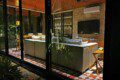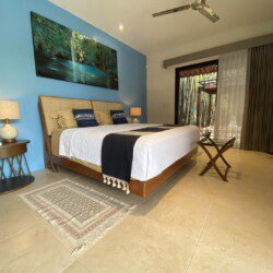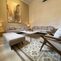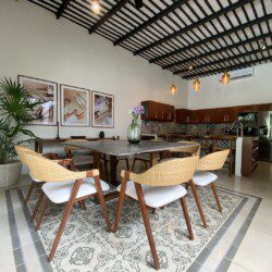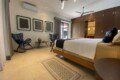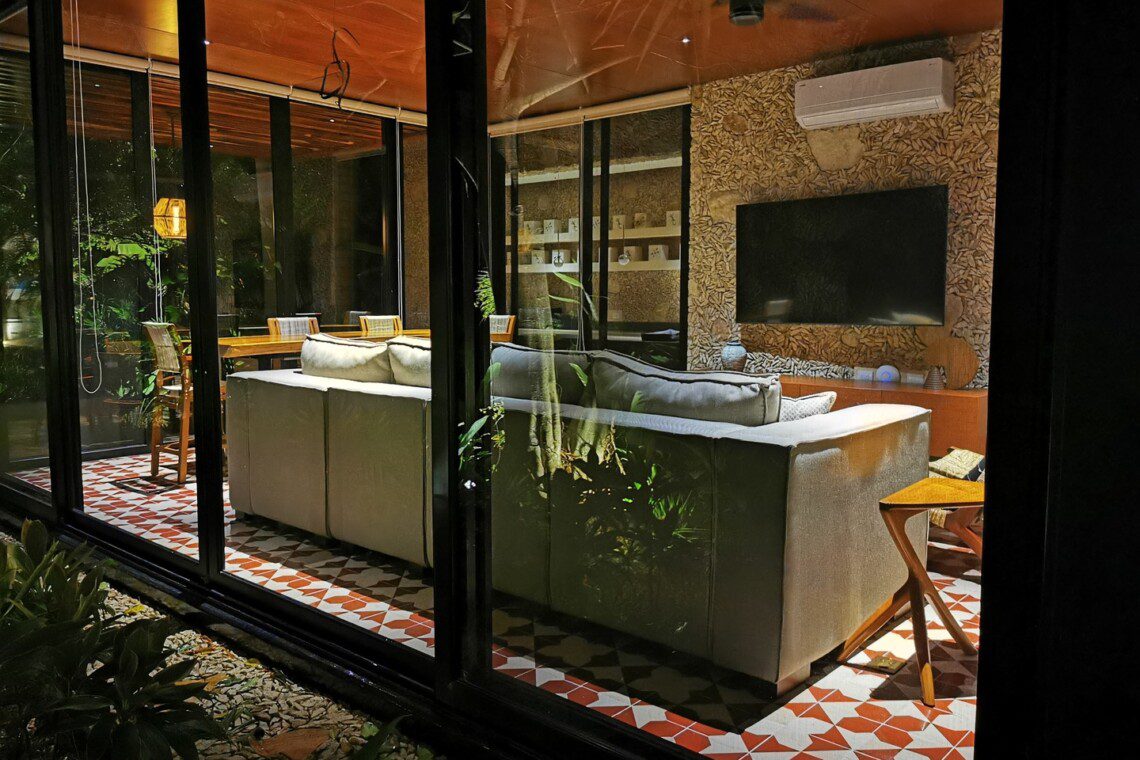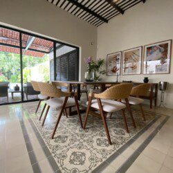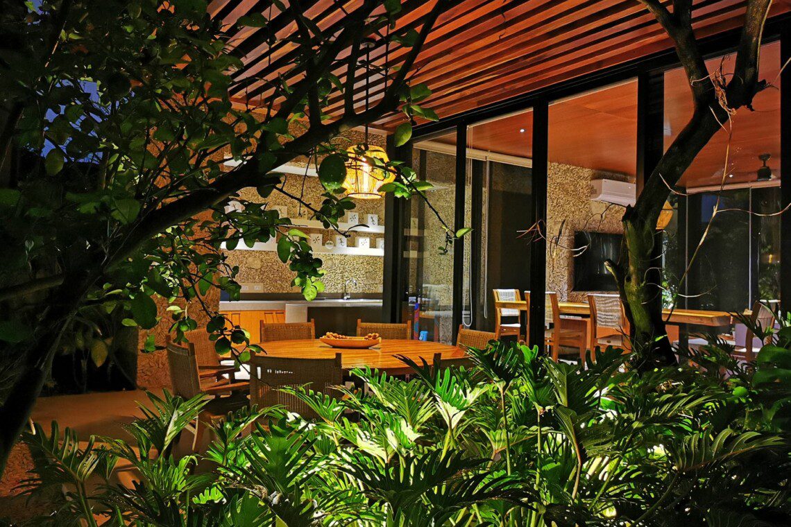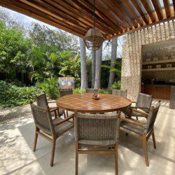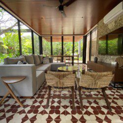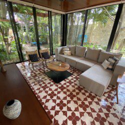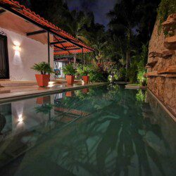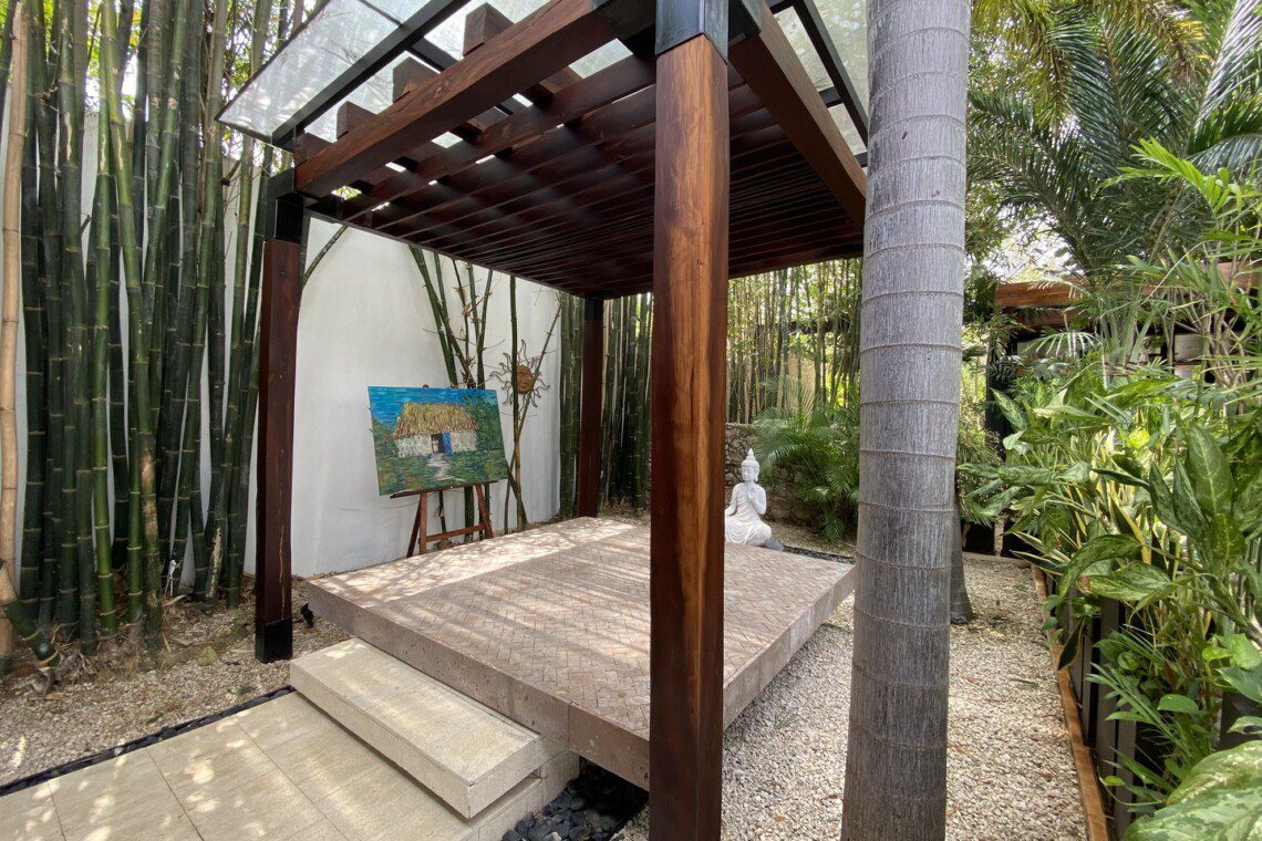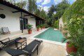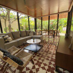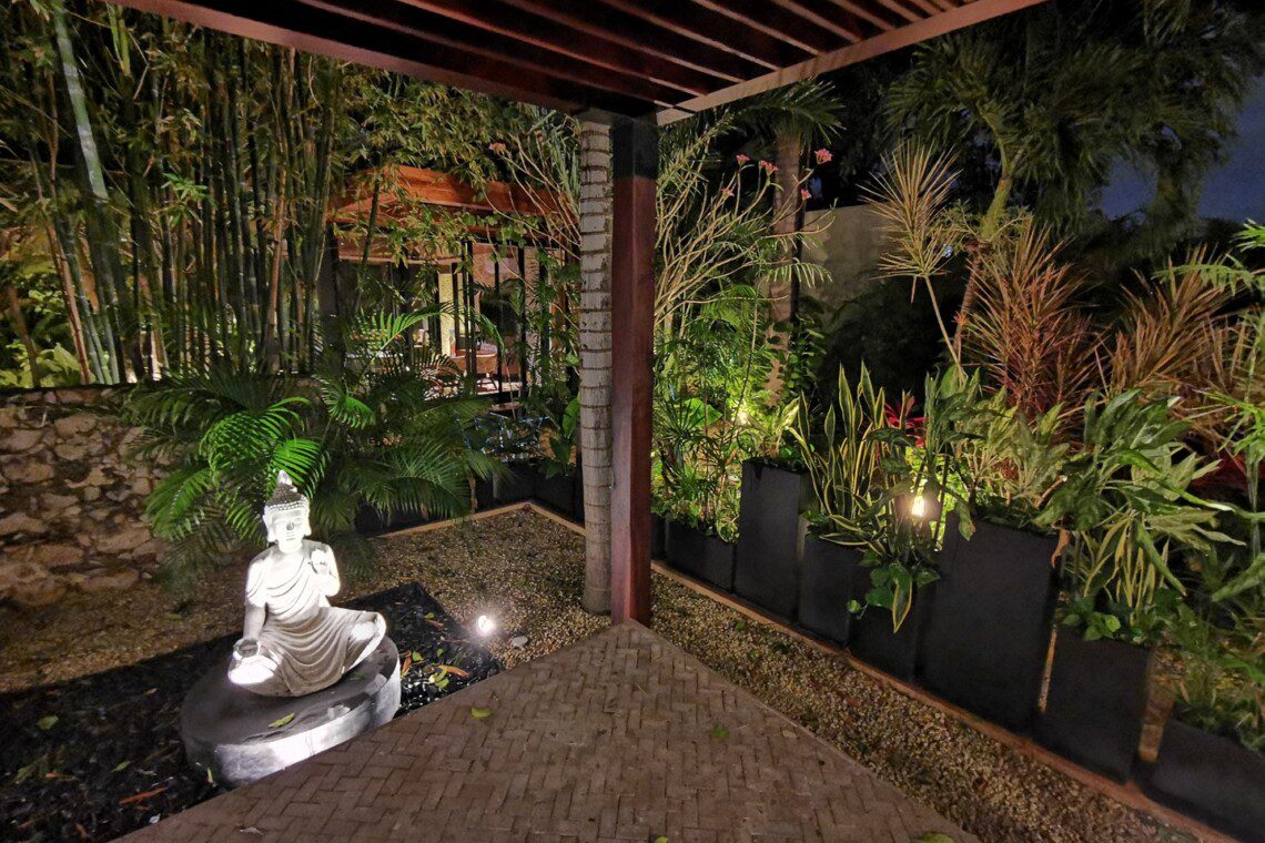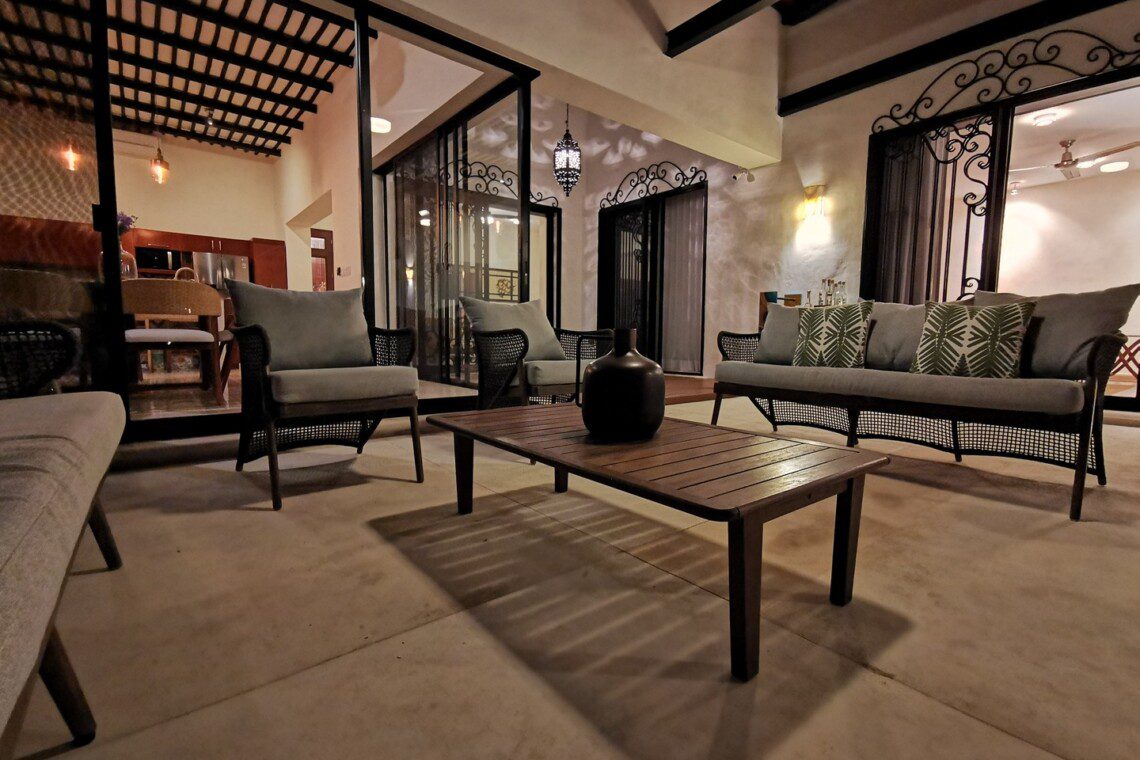 The house compounds three spacious living areas, dining area in the garden, fully equipped kitchen, three bedrooms with ensuite bathroom, entertainment saloon, large pool, meditation pergola, equipped gym, and lots of vegetation.