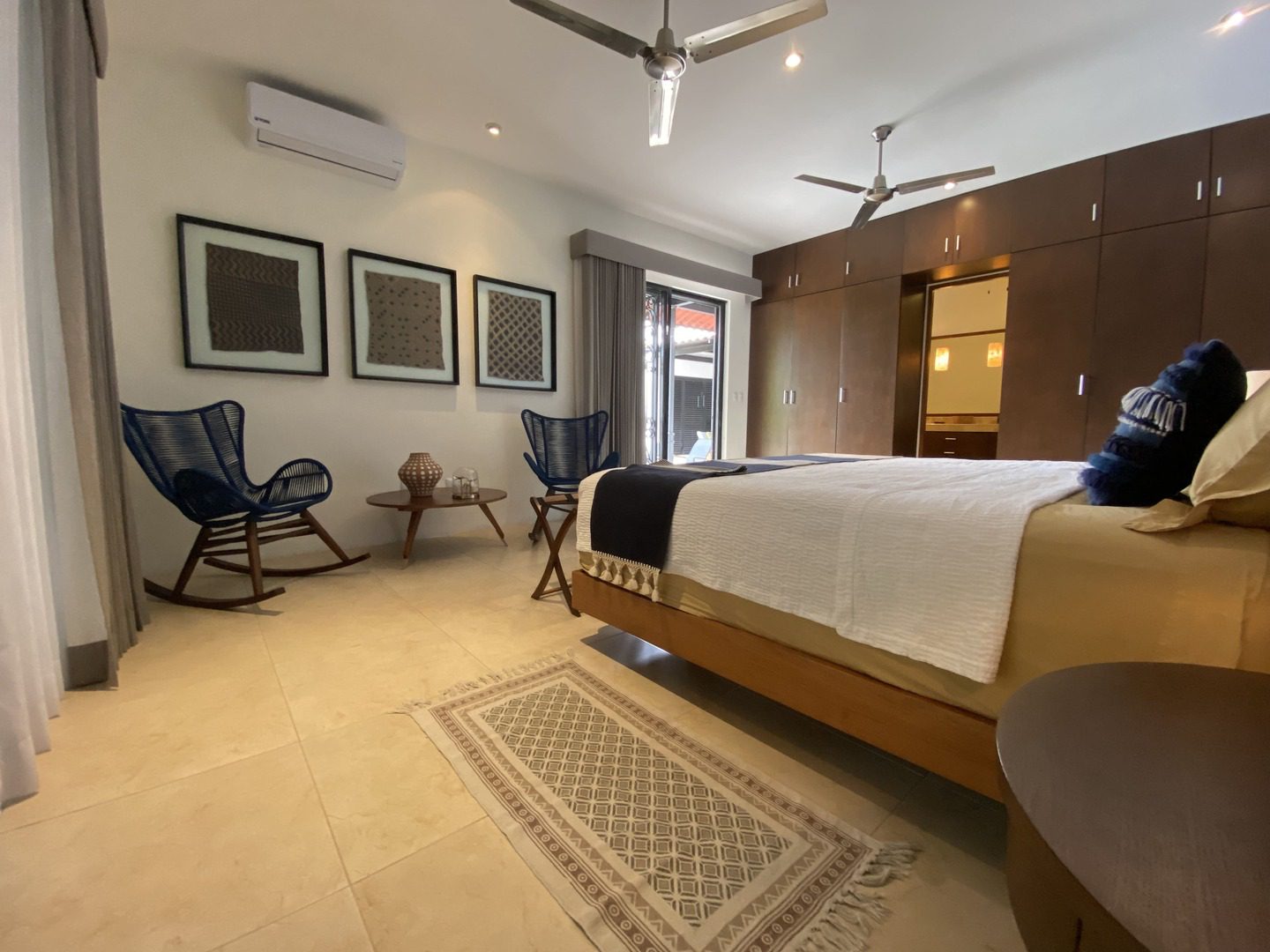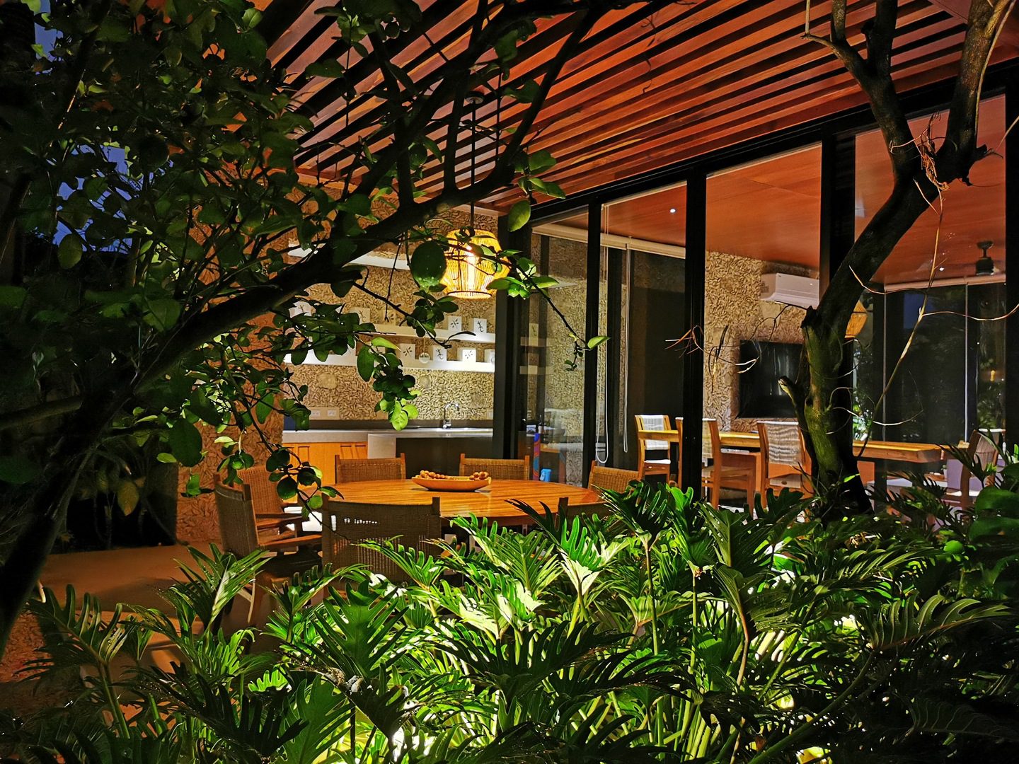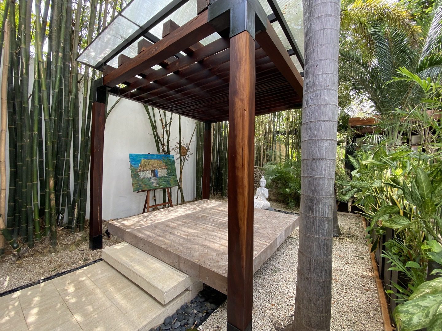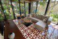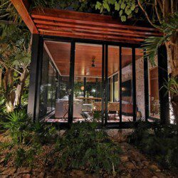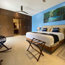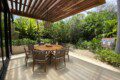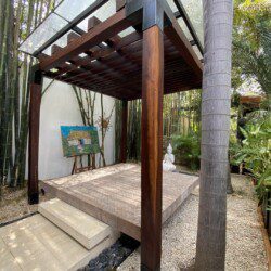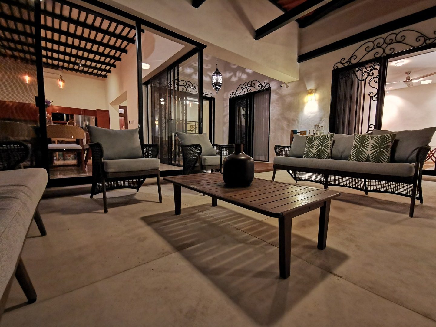 The house compounds three spacious living areas, dining area in the garden, fully equipped kitchen, three bedrooms with ensuite bathroom, entertainment saloon, large pool, meditation pergola, equipped gym, and lots of vegetation.